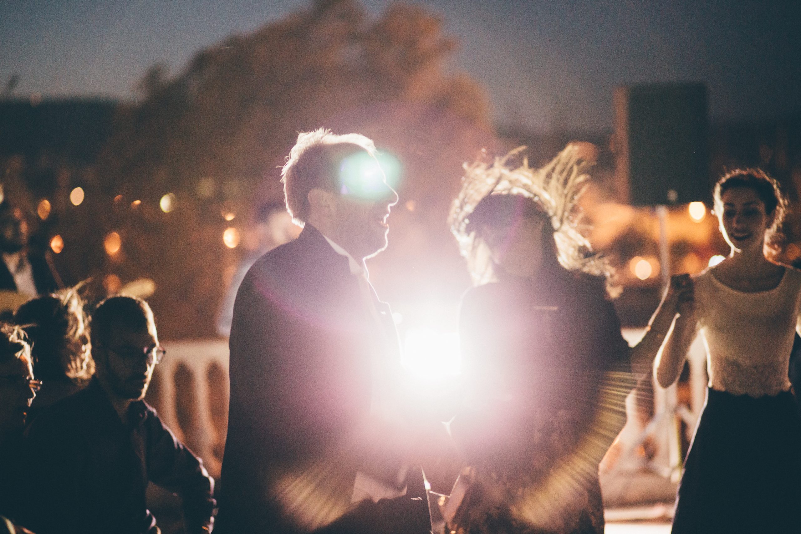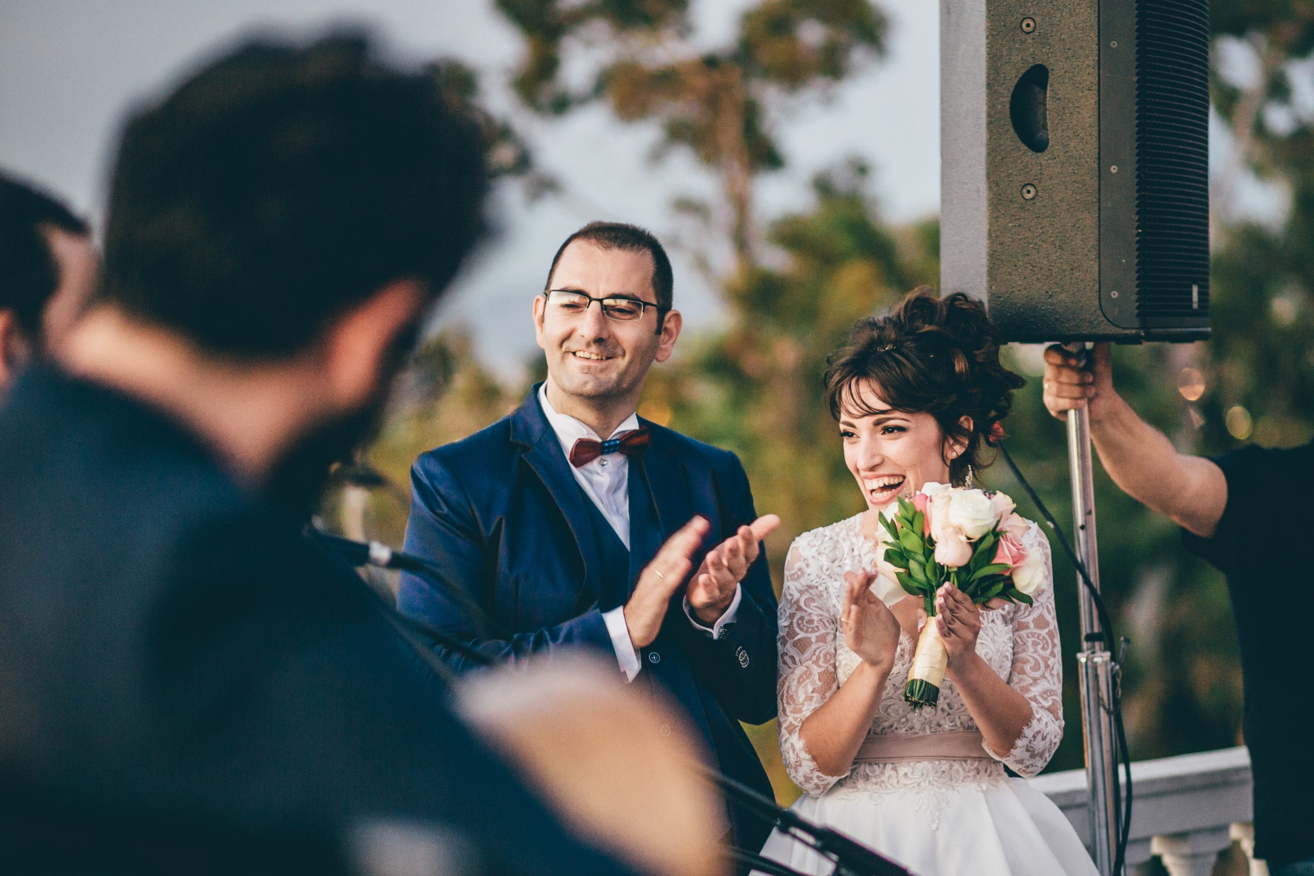 Ύστερα,  απ έξω στον αυλόγυρο της εκκλησίας στήθηκαν λίγα τραπεζάκια με λαχταριστά εδέσματα και άφθονο κρασί και το γλέντι κράτησε μέχρι ο ήλιος να δώσει τη θέση του στο ρομαντικό φεγγάρι.  Το κέφι ανέβηκε κατακόρυφα. Το ζευγάρι μας και οι καλεσμένοι δεν σταμάτησαν το χορό και το τραγούδι. Έτσι γίναμε όλοι μια παρέα και νιώθαμε σαν να είμαστε σε Αιγαιοπελαγίτικο νησί με τις μυρωδιές της θάλασσας να ποτίζουν τα μέσα μας.